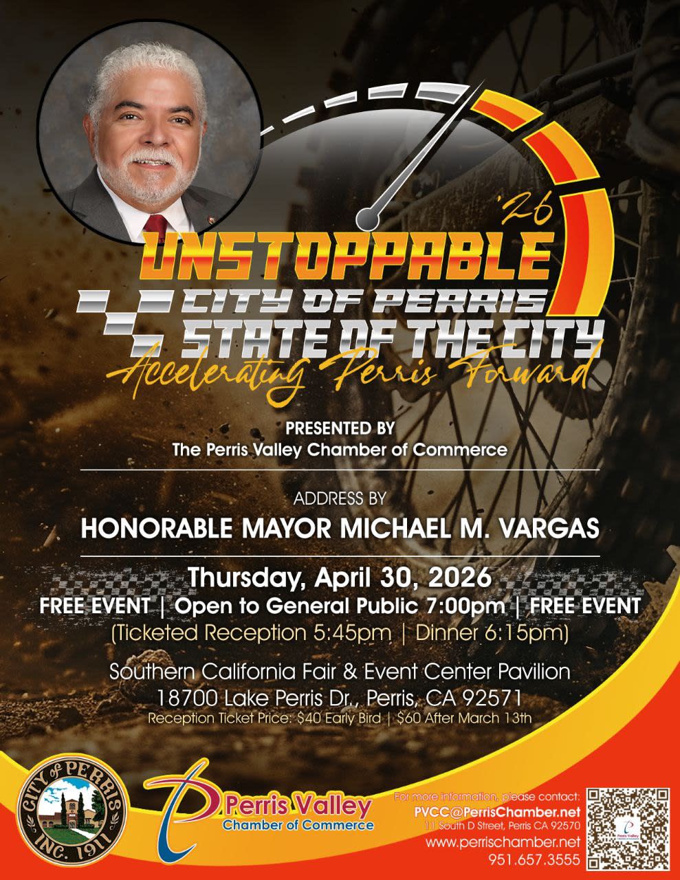 Join us for the City of Perris State of the City Address presented by the Perris Valley Chamber of Commerce.